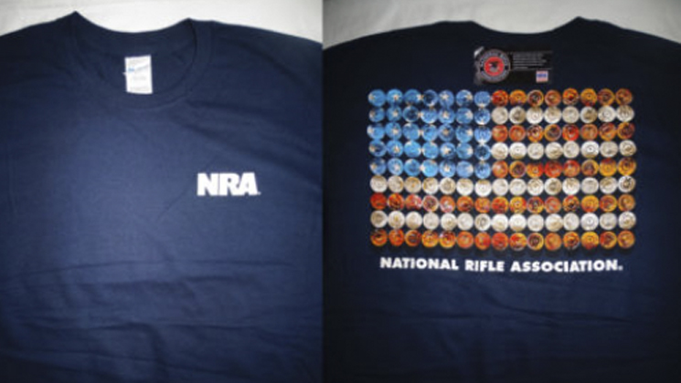 The students donned the casual T’s that picture the NRA acronym on the left front breast of the shirt, and an array of colored ammunition shell casings in a depiction of the American flag on back.