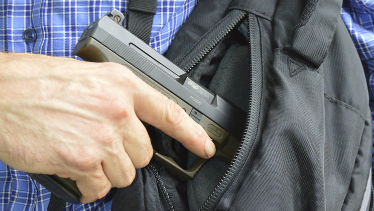 My alternate carry method, and the main one in warm weather, used to be a small travel backpack where I stashed the big Walther wrapped in a T-shirt hidden and jumbled in along with other travel items. I’ve since replaced that improvisation with a purpose designed Freedom backpack from American Rebel. In addition to being a well-designed and rugged backpack, it includes a hidden padded pocket in the lower portion, accessible via a zipper from either side, to securely hold your loaded handgun. The gun is snugly sandwiched between two thick soft surfaced pads that protect it from damage and keep it oriented for a consistent draw. It looks and functions like a normal backpack, so when I’m on a family outing or traveling I can load it with water, snacks, Band-Aids, extra-clothes, lap-top, etc., etc. It has another feature I find especially comforting. There’s a pocket in the back for a ballistic panel which is purchased separately. The panel adds a bit of weight, but I use it all the time because some threats, like the terrible attack at the Harvest Music Festival in Las Vegas last October, can’t be proactively engaged. All you can do is run like heck.
