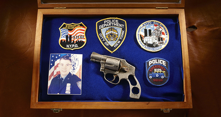 New York police officer Walter Edward Weaver, shield #2784, was known as “Wally” to his family, friends and colleagues. A nine-year veteran of the New York Police Department, he had exerted a great deal of time and effort to qualify for the Emergency Services Unit of the NYPD and, once accepted, moved from Precinct 47 to Squad 3 of the ESU stationed in the Bronx. Sept. 11, 2001, was to have been one of his well-earned days off, but he offered to substitute for a friend and pulled a shift in lower Manhattan that morning. He was last seen on the sixth floor of the North Tower shortly before it fell. He was one of 72 law-enforcement officers who perished that day. Officer Weaver was a proud NRA member, and his parents felt that his Smith & Wesson Model 640-2, recovered from the North Tower debris, would be best displayed at the NRA Museum so that all who saw it would be reminded of the sacrifices so many made that September morning.