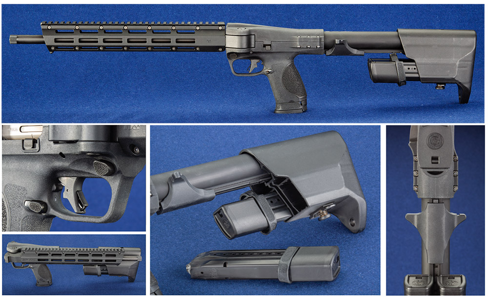 The gun features an aluminum receiver encasing a stainless-steel bolt and carrier. A pistol grip protrudes from the underside. Those familiar with S&W’s popular family of M&P pistols will immediately recognize that is has the same grip. And, yes, magazines load into the grip just like they do with the pistols. Conveniently, the grip accepts the same magazines as used with the M&P 9 pistol, and the FPC comes with two 23-round mags and one 17-rounder. Like the pistols, it also utilizes varying sized palm-swell inserts so that it can be modified to fit anyone.