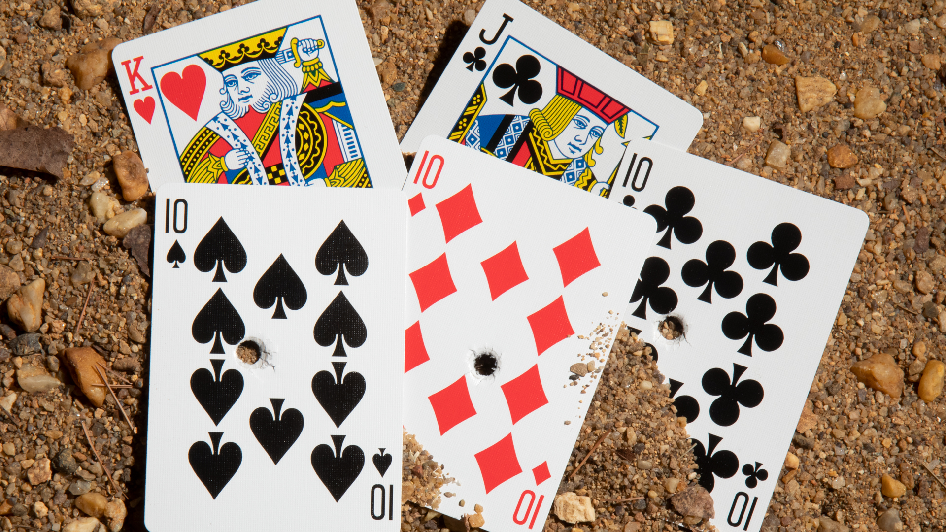 5. Fire five shots at the cards downrange, trying to beat the ghost hand per poker-scoring rules.