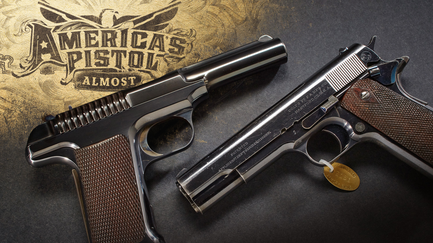 The final shots fired between Colt and Savage in the U.S. service pistol trials began at 10 a.m. on March 11, 1911. Colt serial no. 5 pistol and Savage serial no. 4 pistol went to the firing line, and 6,000 rounds later, the Colt had survived virtually unscathed. Not so for the Savage, which had to have several components replaced. After more than a decade of testing and evaluation, the Colt automatic pistol—caliber .45, model of 1911—had won. This image marks the first time that these two pistols have been together since that last day of competition more than 100 years ago.
