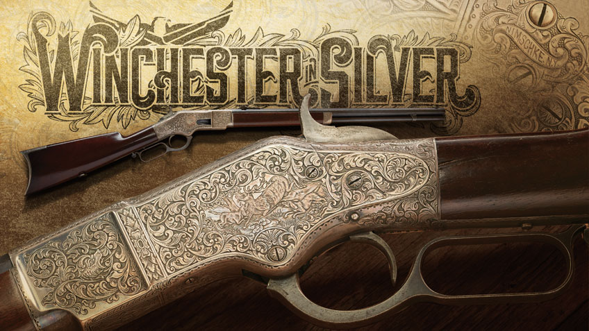 Winchester’s first repeater marked with the company name was the Model 1866, a lever-action that utilized the same .44 rimfire cartridges that the Henry rifle had fired in the American Civil War. Some called the Model 66 the “Yellowboy” in reference to the brass receiver on this Winchester model. But Winchester offered discriminating customers an option in silver. This silver alloy Winchester Model 1866 rifle, currently on loan from Leroy Merz at the NRA National Sporting Arms Museum, also features Nimschke-style engraving with a specially signed banner reading “Nimschke, NY” on the receiver base, amid the deeply intertwined floral and foliate engraving embellishment.