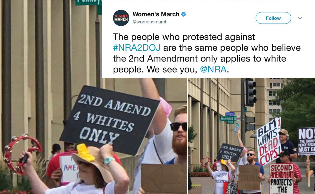 @goodlittletiger made a sign that said: “2ND AMEND FOR WHITES ONLY,” which was her way of articulating a frequent leftist trope that gun rights aren’t for minorities. The Women’s March took a photo of the tweeter holding the sign and opined, “The people who protested against ‪#NRA2DOJ are the same people who believe the 2nd Amendment only applies to white people. We see you, ‪@NRA.”