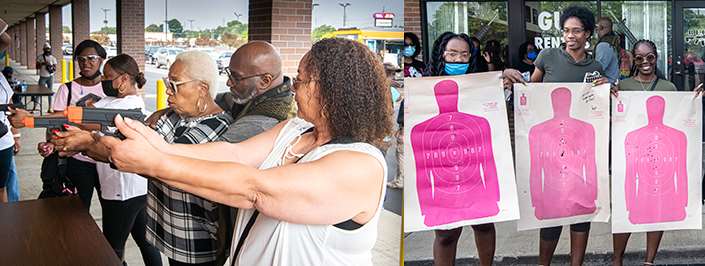 This diversity showed up on range day. Attendees sported Gucci and Louis Vuitton purses, weaves and dreadlocks, tattoos and T-shirts with phrases like “Black is Beautiful” or “Shoot like a Girl.” A variety of instructors had medical kits and holstered pistols. Downrange were flamboyantly pink silhouette targets. Various brands of 9 mm pistols sat waiting—many outfitted with custom grips, modified triggers and mounted red-dot sights. These were next to gleaming, enviable piles of donated 9 mm ammunition.