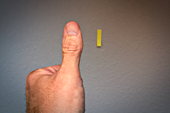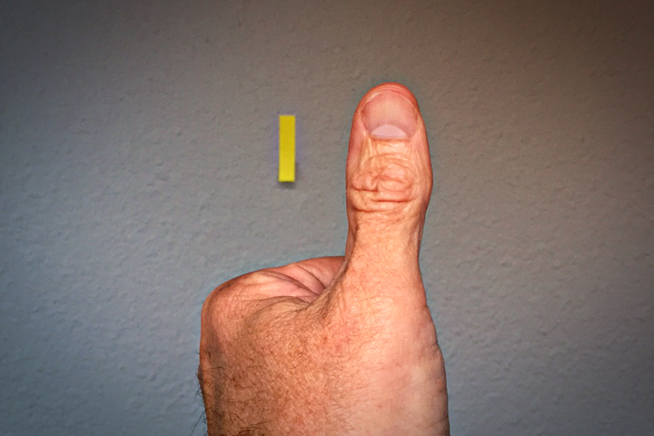 While anything small and stationary will work (like a light switch), we’ve stuck a Post-it tab on the wall for our demonstration photos. Standing back four to six feet, we then hold up our thumb at arm’s length. With both eyes open and focusing on the thumb, move the thumb until the target object is obscured, or at least grows decidedly fuzzy (you may see a shadowy thumb superimposed on the target—this is fine for our purposes).