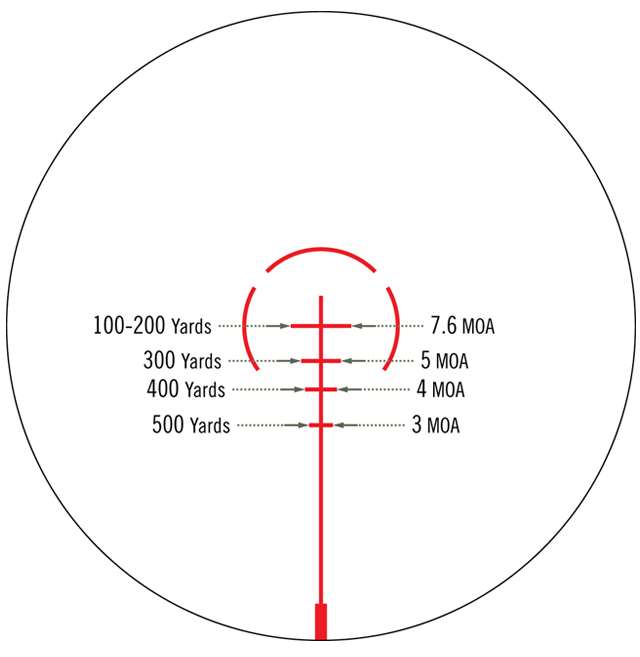 When we moved out to 300 yards, the fact that the rifle had never been properly zeroed finally showed, but a little adjustment put us back on our MGM 2/3-sized reactive silhouette in no time. Here, we thought the reticle was a huge help. 3x may not sound like much, but the inverted, interrupted horseshoe (18.85 MOA diameter) reticle framed targets extremely well. For longer engagements, the reticle has drop compensation markings for 300, 400 and 500 yards, with decreasing subtensions so they can be used for ranging as well. It’s lighted, of course, in red or green, and no zero shift from -22 to +122° F.