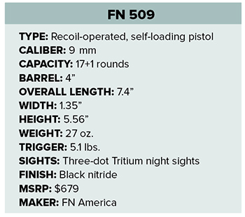 The 509’s slide lacks a bushing—a good thing—and is machined with cocking serrations front and rear, with the front contour of the slide beveled so it feels less like a 2x4 in your holster. The wedge shape of the slide is easy to align with the holster opening, and plenty of holsters are made for it. Tritium three-dot night sights come standard on this gun. (Given the MSRP of the 509, it seems like FN is handing out night sights as freebies.) Also, for those who have trained for it, the rear sight is an upright blade that can be used as a one-handed cocking or slide-manipulation ledge.