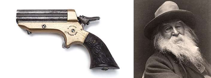 He was once savagely attacked in Washington, D.C., and suffered greatly at the hands of street thugs who bloodied and bruised him, robbing him as well. More than one modern historian has speculated that the attack was instigated by a soldier who was a recipient of an unwanted advance from Whitman. No matter the reason, Walt Whitman, in 1870, purchased a .30-caliber, C. Sharps & Co. of Philadelphia, four-barrel “pepperbox” pistol and had his name engraved on the backstrap. His Sharps was designed by Christian Sharps, who had designed and manufactured the breechloading rifle and carbine that bears his name, both of which saw extensive use from the John Brown raid in 1859 throughout the Civil War. This pepperbox pocket gun was a constant companion of Whitman, the pistol-packing poet, until his death in 1892. Graciously loaned by Dr. Richard Labowskie, ASAC.