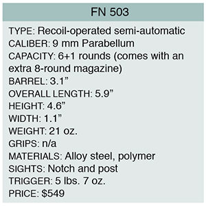 Enter the FN 503, which is just about as small as you can make a striker-fired pistol and still have it hold six rounds of 9 mm ammunition. The small size does require some compromises, which, for starters, means less capacity than a wide-body 9 mm. The 503 comes with an eight-round magazine, should you need the larger size, or want eight rounds on your reload from the first six-plus-one.