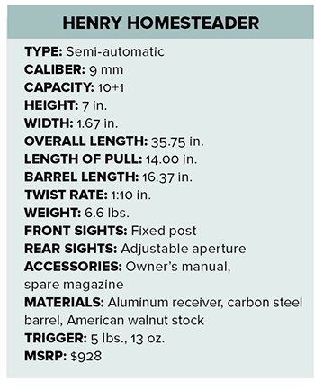 Henry’s first pistol-caliber carbine (PCC) is chambered in 9 mm Luger, the round of choice for today’s cowboy (and everybody else). Departing from its signature tube-fed designs, the new carbine feeds from proprietary detachable box magazines, with both a 5 and 10-rounder included. Henry also offers conversion kits that allow the Homesteader to accept Glock or SIG/M&P mags.
