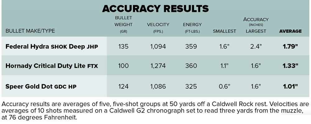 Good groups require good ammunition, but which ones? With the 9 mm selection now restored to pre-pandemic levels, I chose three on the lighter side, as they typically bode well with unsuppressed use: Hornady’s Critical Defense Lite 100-grain FTX, Federal’s 135-grain Hydra-Shok and the 124-grain Speer Gold Dot.