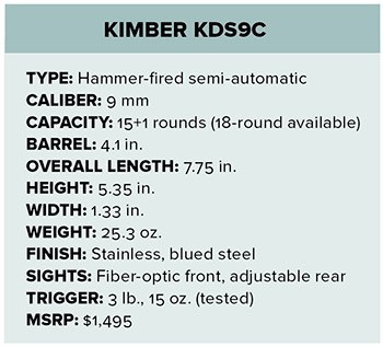 The Kimber KDS9c is something of a cross between a Model 1911 and a Glock, offering a 15-round capacity—with an 18-round magazine available.