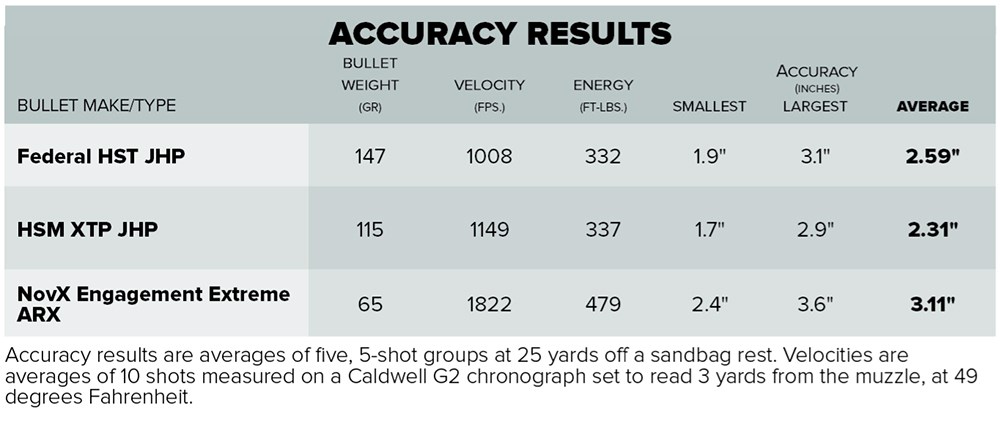 I took my sample to the range with a wide variety of ammunition to cover all purposes and to see what it might like best. Every firearm has a personality, and ammunition that shoots well in one often doesn’t shoot well in another. Among my stable were Federal’s heavy HST defensive fodder, HSM’s lightweight practice load and NovX’s featherweight CCW ammunition, which advertises an unheard-of velocity.