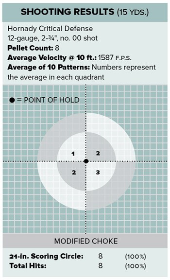 Although it is a capable slug gun, I swapped in the cylinder bore choke for use with buckshot during my testing. My fodder of choice was Hornady’s 2 3/4-inch Critical Defense, which delivers eight 00-sized pellets onto target in some of the tightest patterns I’ve seen. It achieves this through the Versatite wad, which assures proper constriction for defensive encounters and mitigates collateral damage. Additionally, these are formulated with semi-automatics in mind, and, given that inertia guns can be picky, I felt this would ensure that I had a smooth, trouble-free testing session.