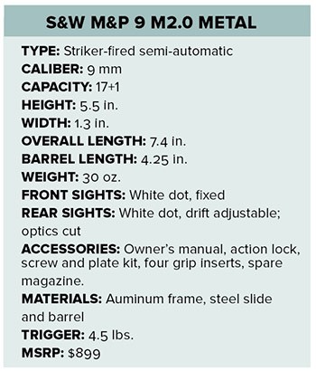 Moving down to the frame, it was obvious that S&W wanted this gun to be comfortable for as many shooters as possible. Unlike many metal-framed pistols, the M&P 9 M2.0 Metal comes with interchangeable backstraps, with four included in the box. This allows the owner to tailor the gun to his or her hand for a grip that best accommodates a complete purchase and proper trigger reach. S&W also carried over the reversible magazine catch and ambidextrous slide stop to ensure southpaws like myself—and any righties who need to shoot from their non-dominant side—can easily work the action. The only active safety that exists is on the trigger bow, so we can call that feature ambidextrous as well. (I’ve been stressing the importance of guns like this to my students for over a decade, as you must consider what happens if your primary hand is occupied before or immediately after an altercation starts.) You’ll also note a slightly undercut trigger guard, a Picatinny rail and a nice thumb ledge or groove to aid in recoil control.