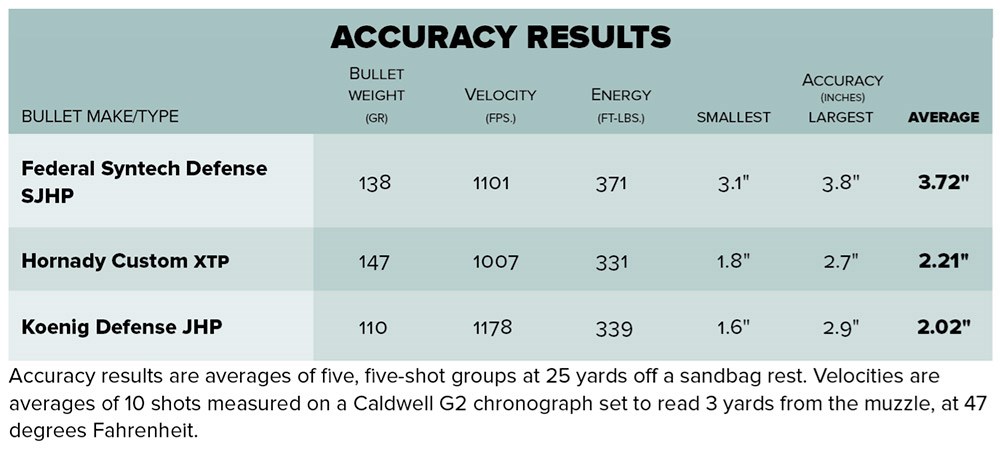 I decided to keep my test fodder limited to hollow-point designs, as that be what I’d keep in it on a daily basis. Hollow-point ammo is also the hardest to feed, so that would provide an acid test of sorts. In the assortment, I had Federal’s newer Syntech Defense rounds, Hornady’s Custom XTP ammo and Doug Koenig’s own 110-grain defensive load.