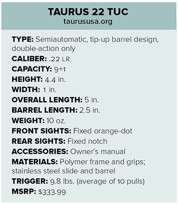 I have long been a proponent of using the .22 LR cartridge for limited self-defense work. By no means should it be your primary consideration, but it still fits where larger cartridges simply can’t—literally and figuratively. Staging or carrying a .22 LR pistol is an effective means of having a backup on hand. Taurus’ 22 TUC pistol can easily fill this role and comes with a side of “easy to handle.”