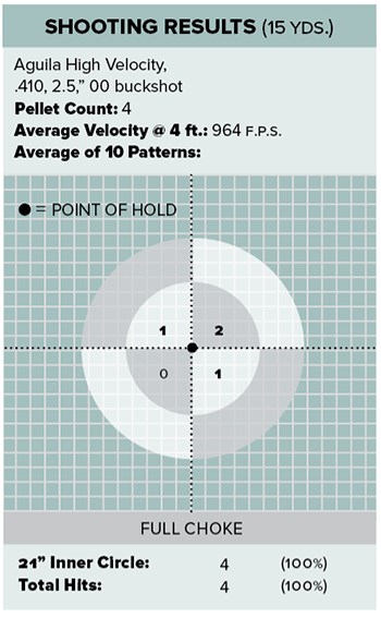 Using Aguila’s high-velocity 00 buckshot, I dropped a single shell into the chamber and fired from the hip. I didn’t think it would be wise to start at eye level, as I only had an assumption of both the firearm and ammunition’s recoil at this point in our relationship. Well, the Axe produced minimal recoil that is best likened to a large-format pistol chambered in .223 Rem. With that worry behind me, I sighted down the barrel and patterned the gun at 15 yards, which I considered the outer limits of its range. I was indeed surprised to see that every shot put all four of its pellets within my 21-inch scoring circle, but as a whole, the impact was about three inches high and maybe two inches right. I experienced uninterrupted function and admittedly even a few schoolgirl-like giggles throughout the test. This thing was fun to shoot!