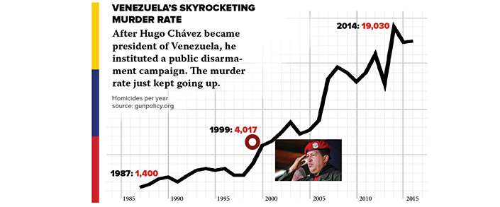 In 2014, a further 26,000 firearms were confiscated or crushed—coincidentally, Venezuela clocked in as having the world’s second-highest homicide rate that very same year. Each year that the gun-control reins were pulled tighter, murder rates increased.
