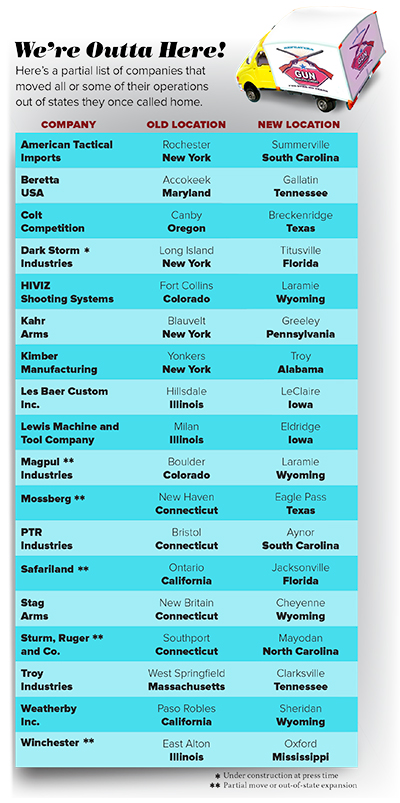 “I call it the ‘we’re outta here’ list,” said Larry Keane, executive vice president and chief counsel for the National Shooting Sports Foundation (NSSF), the shooting sports industry’s trade organization. Keane said economic development organizations from across the nation hold numerous meetings with shooting-industry companies interested in a better location—better both economically and culturally.