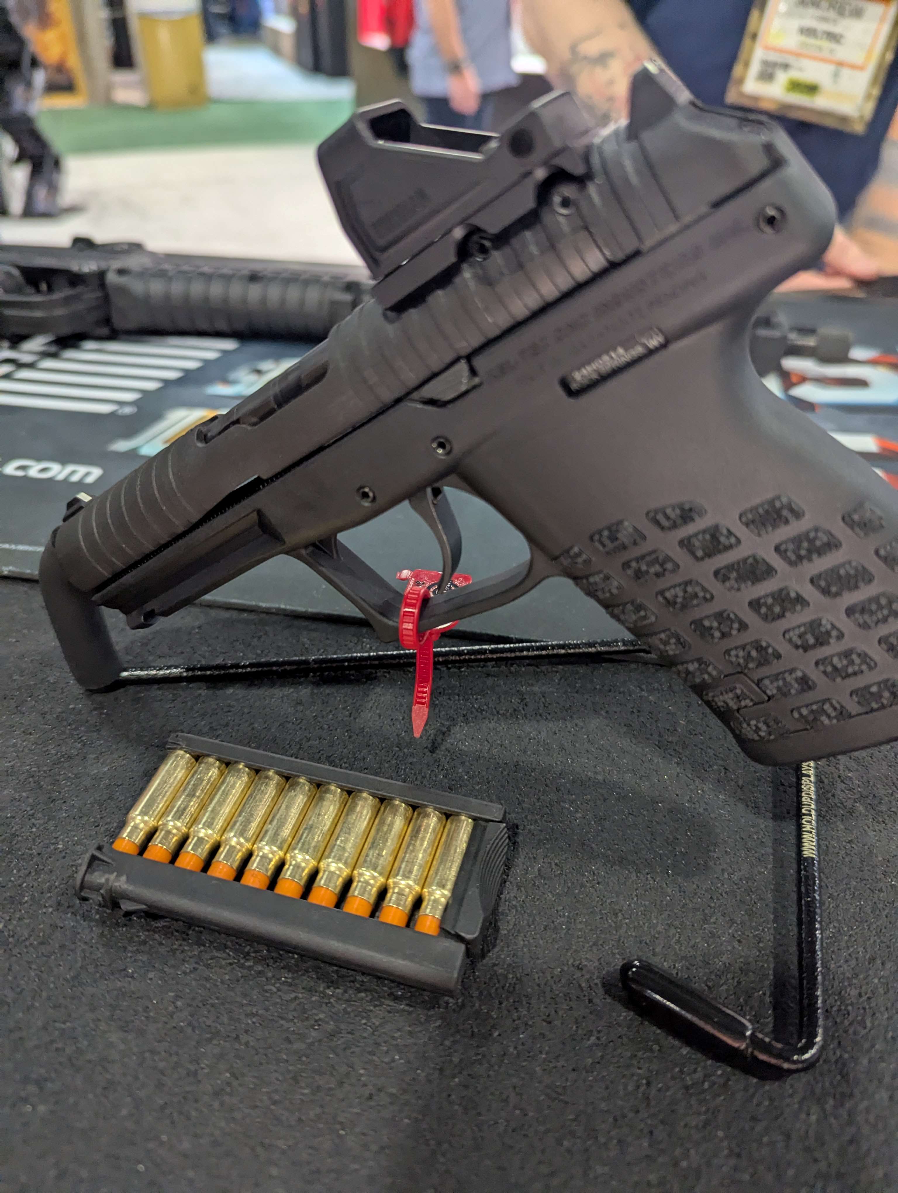 Even with that mind-boggling setup with which to compete, the most-talked-about “wow” item seemed to be KelTec’s PR57, a 20-round pistol in 5.7x28 mm. Why is it so wow? Well, it’s a top-loader with no magazine. You can either load the rounds in one by one or use a stripper clip to load them, but either way, you’re going through the top. This caliber shoots nicely, the gun is cut for an optic, and having 20 rounds in a gun that is sized for everyday carry is a definite selling point. (NRA Media’s Kevin Creighton shoots the PR57 in this short video.)