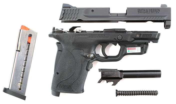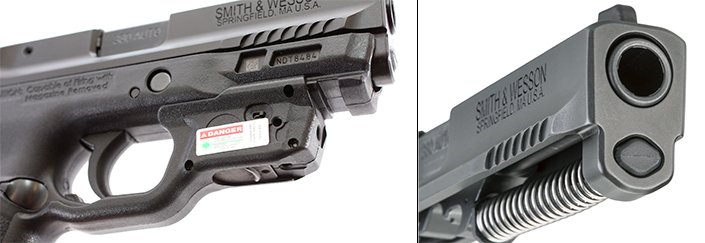 The frame has an accessory rail where you can mount a light, laser or combo unit. The 380 Shield EZ that arrived for review came with a Crimson Trace Green Laserguard already installed. The Crimson Trace clamps onto the accessory rail, while the activation button is part of the laser body extension. The extension closely follows the trigger guard down under the magazine button (this is reversible for left-handed shooters). When you pick up the 380 Shield EZ, pressure on the laser button turns on the beam. It is easy to learn how much pressure you need to activate the laser. It also provides a good tactical reminder: Don’t clutch the pistol. When you pick it up, the laser will pop on.