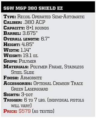 As a main carry pistol for hot-weather clothing, or for those who might find that a 9 mm recoils too much, the M&P 380 Shield EZ is a good choice. And if you are looking for a light, compact, easy-to-shoot .380, but aren’t a fan of lasers, the 380 Shield EZ sans laser is only $399. That’s a good deal.