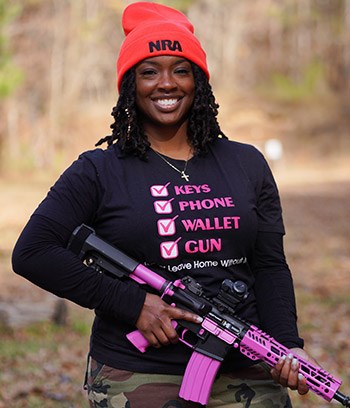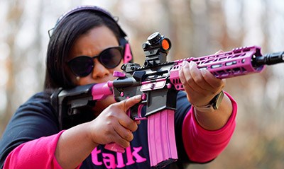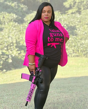 Evans: So, my pink AR is my baby. When I started Chicks with Triggers, I realized that a lot of the women—when they come in and they see the black guns—are intimidated. I started paying attention to the bags they were bringing and the designer things they were wearing. It then occurred to me to make the guns match their apparel. And that was a complete game-changer. I added color to the guns. I made them designer guns. And, all of a sudden, the fear just started going away. I always say that when you are terrified about something, you can’t learn about it effectively. But, once I took that fear away, they began to learn better.