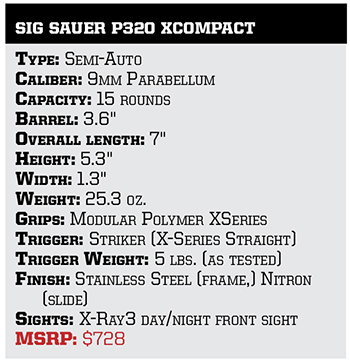 Enter the SIG Sauer P320 XCompact. Based on the P320 basic design, the XCompact brings a host of improvements to a small and portable package, one of which is its optics-ready construction. Most other features of the pistol are pure SIG Sauer P320. It’s a striker-fired, polymer-framed, stainless-steel slide pistol. You’ve got a three-slot rail up front, front-cocking serrations, relief cuts under the trigger guard and an ample beaver tail. Considering its portable overall size, its 15+1 capacity is generous.