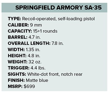 The prices of the older Hi-Powers have been climbing, due in part to FN stopping manufacture a few years ago. They went past a thousand dollars soon after we got that news and have kept going up. Even when in production, they cost more than similar-sized 9 mm pistols, and you could easily double the cost of an old one by getting the necessary upgrades that Springfield now provides as standard features. All this makes the SA-35’s list price of $700 seem very reasonable. So, if you want a daily carry gun (or just an accurate and comfortable 9 mm plinker) that’s all steel, and you like blued steel and walnut, your path is clear.