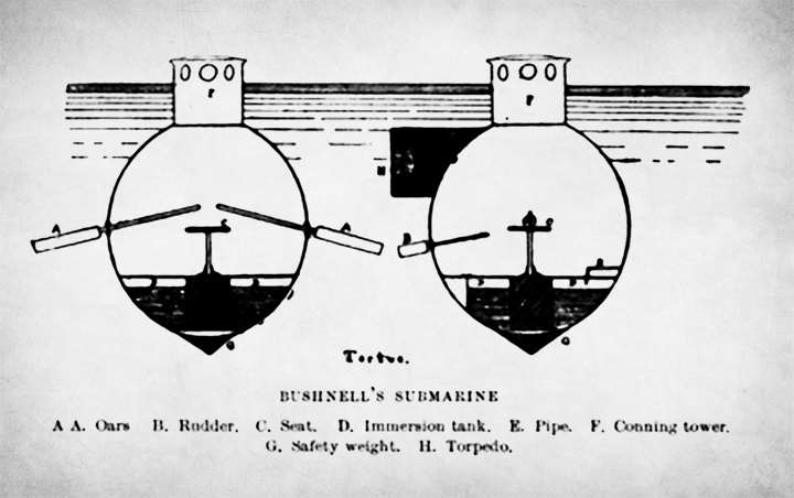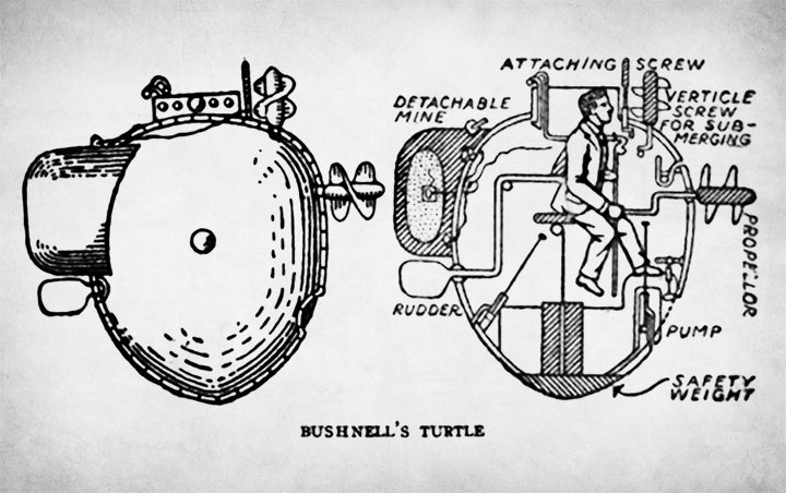 The Turtle of 1776 was therefore primitive and modern at the same time. Its name derived from two vaguely hemispheric wooden halves covered with tar for waterproofing, and bound together by metal hoops. The brainchild of framer, patriot and Yale student David Bushnell, the proposed use went hand-in-hand with another invention of his—a workable underwater explosive.